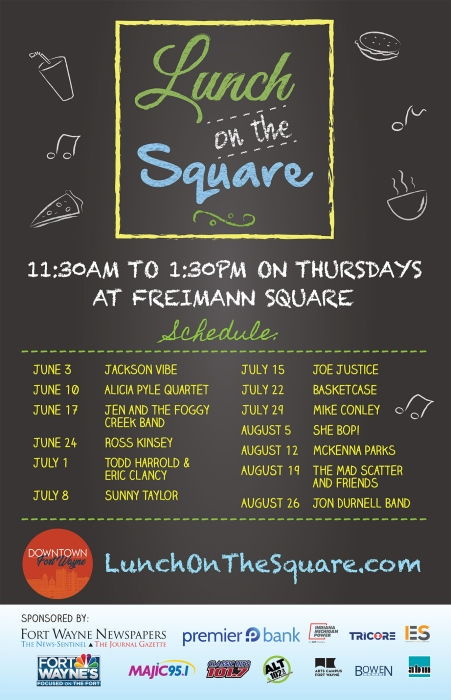 Lunch on the Square is presented by your Downtown Improvement District and sponsored by: Fort Wayne Newspapers, Premier Bank, Fort Wayne’s NBC, MAJIC 95.1, CLASSIC HITS 101.7, ALT 102.3, Indiana Michigan Power, Innovative Engineering Services, Bowen Center, TriCore Logic, Allen Business Machines, and Arts Campus Fort Wayne.