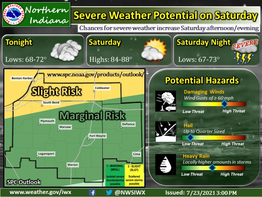 Chances for severe weather increase Saturday afternoon/eveningFort Wayne, Indiana (July 23, 2021) – This weekend brings chances for scattered showers and storms, including some that could be strong to severe. Overnight, temperatures drop into the upper 60s to lower 70s under mostly cloudy skies. Tomorrow, expect near-normal temperatures with rain chances gradually increasing throughout the day. Right now, the best chances for severe weather come late on Saturday afternoon into the evening (5-11PM), although confidence is still low on exact timing and location. There is a slight risk (level 2/5) for severe weather, particularly in southern Michigan and to the northwest of our warning area, including South Bend, Indiana. A Marginal risk (level 1/5) exists for northern Indiana and northwest Ohio, including Fort Wayne, Indiana. Primary hazards include damaging wind gusts, small hail, heavy rain, and frequent lighting, although an isolated tornado cannot be ruled out. Stay weather aware and check out our webpage and social media for forecast updates!