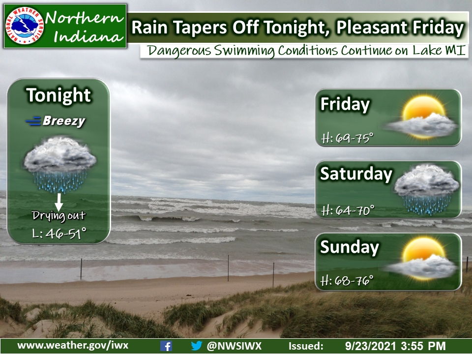Fort Wayne, Indiana (September 23, 2021) – The rain will taper off tonight and give way to warmer temperatures and sunny skies to end the work week. Rain returns again on Saturday. Dangerous swimming conditions continue on Lake Michigan beaches.