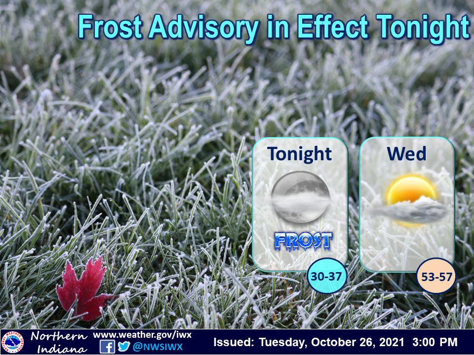 Fort Wayne, Indiana (October 26, 2021) – A Frost Advisory is in effect tonight with lows in the lower to middle 30s. Plan to bring cold-sensitive plants indoors. Wednesday will be dry with some sunshine and highs in the 50s. Rain returns to the area on Thursday and persists into Friday.