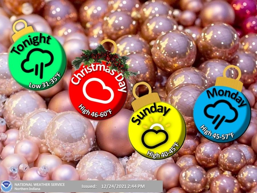 Fort Wayne, Indiana (December 24, 2021) – Clouds persist through the Holiday weekend with rain tonight through mid-day Christmas day. After a break in the weather Sunday, another round of showers and mild temperatures return to start the final week of 2021.