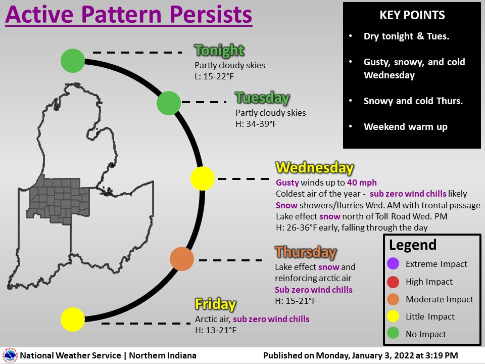 Fort Wayne, Indiana (January 3, 2022) – Lows tonight will drop into the teens to low 20s. Tuesday will remain dry with highs in the 30s. An arctic front will move into the area Wednesday bringing gusty winds and the coldest air of the year. A few snow showers and flurries are possible with the passing of the front Wednesday morning, with lake effect snow along/north of the Toll Road Wednesday night with light accumulations and minor impacts possible. More impactful lake effect snow and a reinforcing shot of arctic air moves in on Thursday into Friday. Subzero wind chills will settle in late Wednesday and persist at times through Friday.