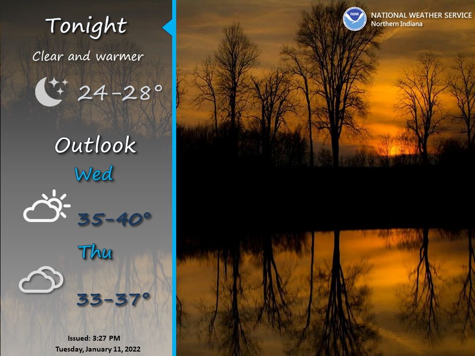 Fort Wayne, Indiana (January 11, 2022) – A bit warmer and continued dry through Thursday.