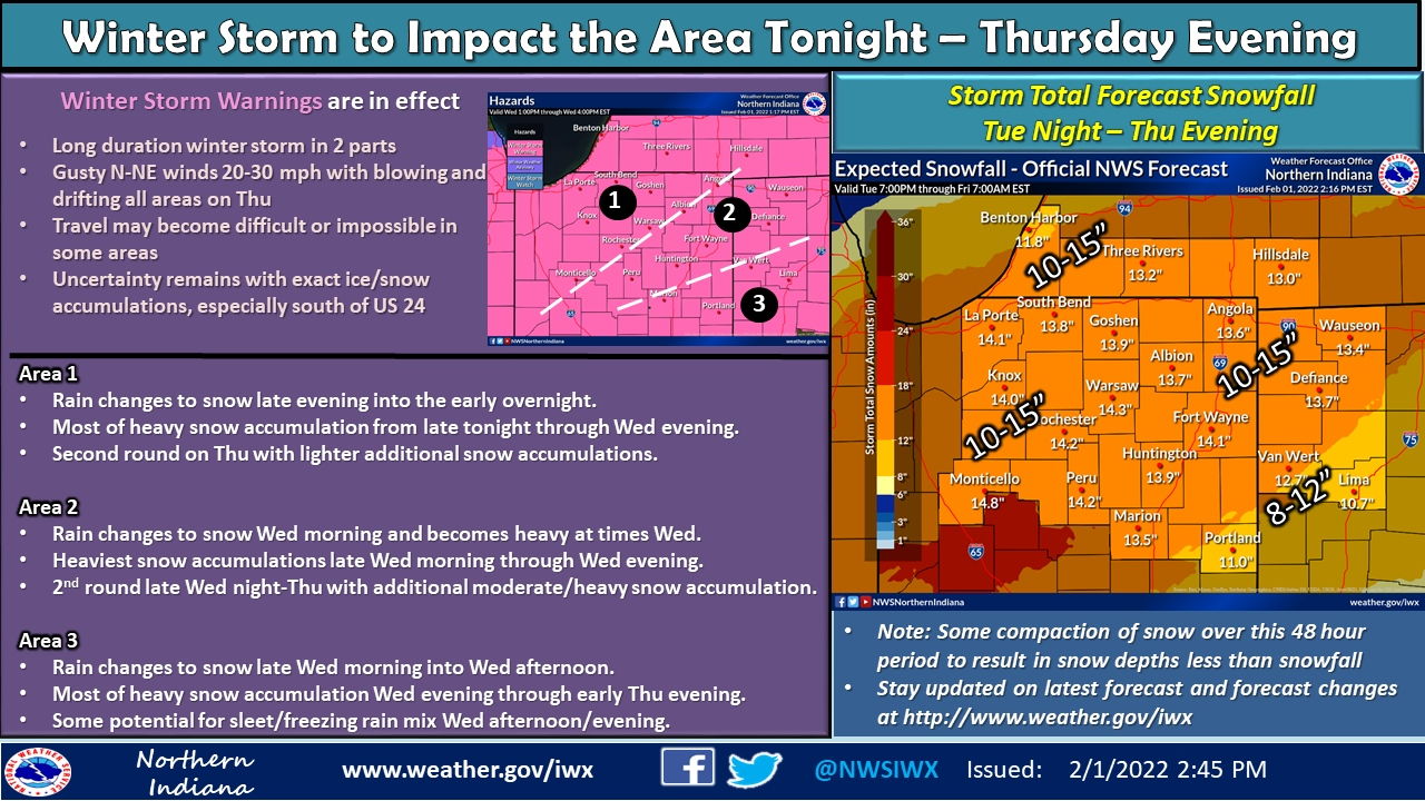 Fort Wayne, Indiana (February 1, 2022) – A long-duration winter storm will impact the area from tonight through Thursday night. This winter storm will come in two rounds, with the first round from tonight through Wednesday evening, followed by a 2nd round late Wednesday night into Thursday. Storm total snow accumulations in excess of 1 foot are a good possibility across many locations. North to northeast wind gusts to around 25 mph will result in widespread blowing and drifting snow on Thursday. Travel will become very difficult in some locations. Hazardous travel conditions may persist into Friday as the north winds begin to diminish. In addition, some sleet and freezing rain is possible for a brief time mainly along and south of US Route 24, but the main impacts from this storm will be due to the dangerous combination of snow and gusty north winds. Stay tuned for later updates as this winter storm continues to evolve.