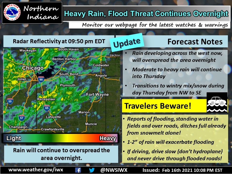 Fort Wayne, Indiana (February 17, 2022) – Our event is underway, with rain overspreading the area. If traveling be cautious, we’ve already received reports of full ditches and saturated fields-in addition to water over the roads in many places. This is from the snowmelt ALONE. Conditions will continue to deteriorate overnight as we see around 1-2 inches of rain from this initial wave.