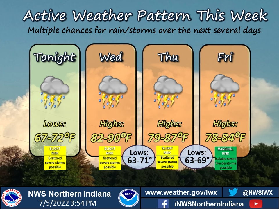 Multiple chances for rain/storms over the next several daysFort Wayne, Indiana (July 5, 2022) – An active summertime pattern is setting up across our forecast area, with multiple rain/storm chances in the coming days. This may be beneficial to areas that have yet to see relief to drought conditions. Some storms could be strong to severe. Otherwise, temperatures will be cooling slightly, with highs in the low to mid 80s by the end of the week.
