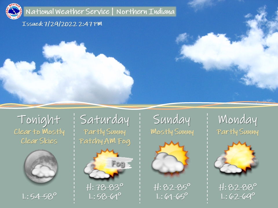 Fort Wayne, Indiana (July 29, 2022) – Temperatures will drop into the mid 50s under mostly clear skies overnight. Patchy fog is possible tomorrow morning. Sunshine and seasonable temperatures are expected this weekend and into Monday.