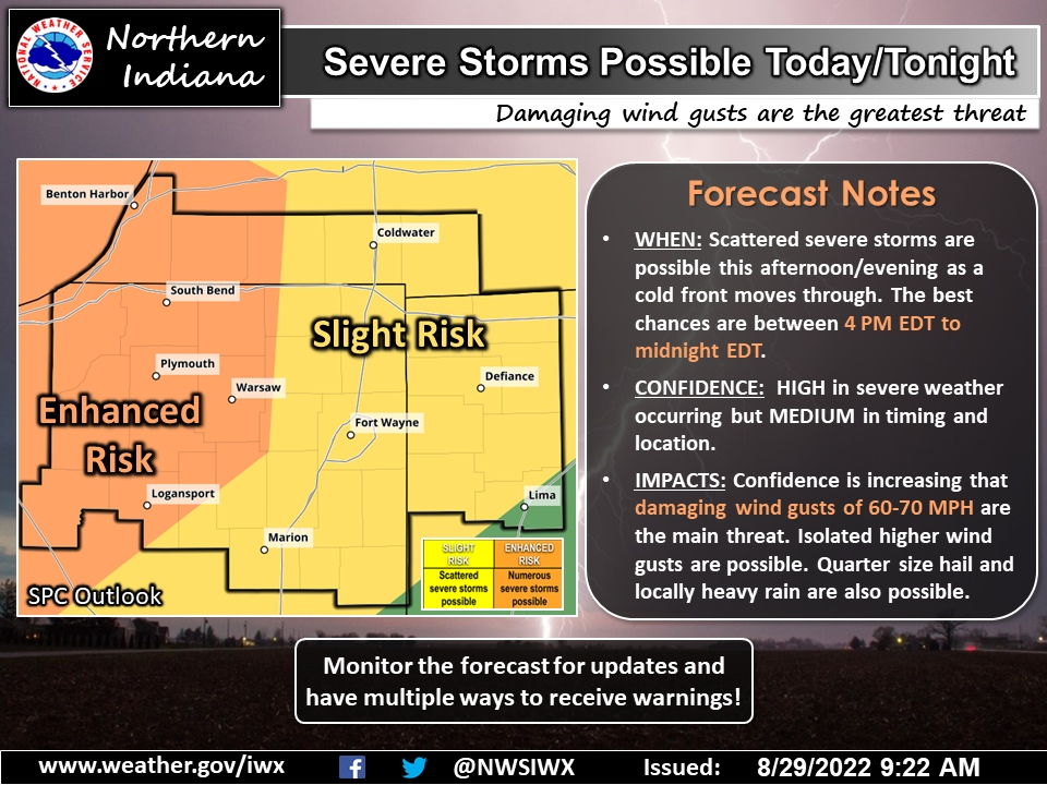 Fort Wayne, Indiana (August 29, 2022) – The SPC has expanded the Enhanced Risk to cover the western half of our forecast area. The Slight Risk has also been expanded eastward into northwest Ohio. Our thinking on timing and type of severe weather remains unchanged from the previous post. Monitor our social media and website for updates!