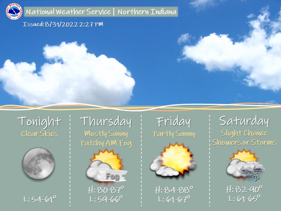 Fort Wayne, Indiana (August 31, 2022) – High pressure will keep the area dry through the end of the week with gradually warming temperatures. The next chance for rain won’t be until Saturday evening, but confidence is low.