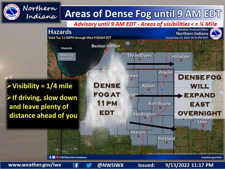 Fort Wayne, Indiana (September 13, 2022) – Dense fog had developed early tonight and is expected to persist and expand east overnight. The entire area is under a dense fog advisory until 9 AM EDT for areas of dense fog with visibilities of a quarter of a mile or less.
