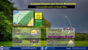 Fort Wayne, Indiana (September 20, 2022) – Very warm weather for this time of year is ahead today and Wednesday. A strong cold front will bring thunderstorms with a small chance for a severe storm over northwest Ohio Wednesday.