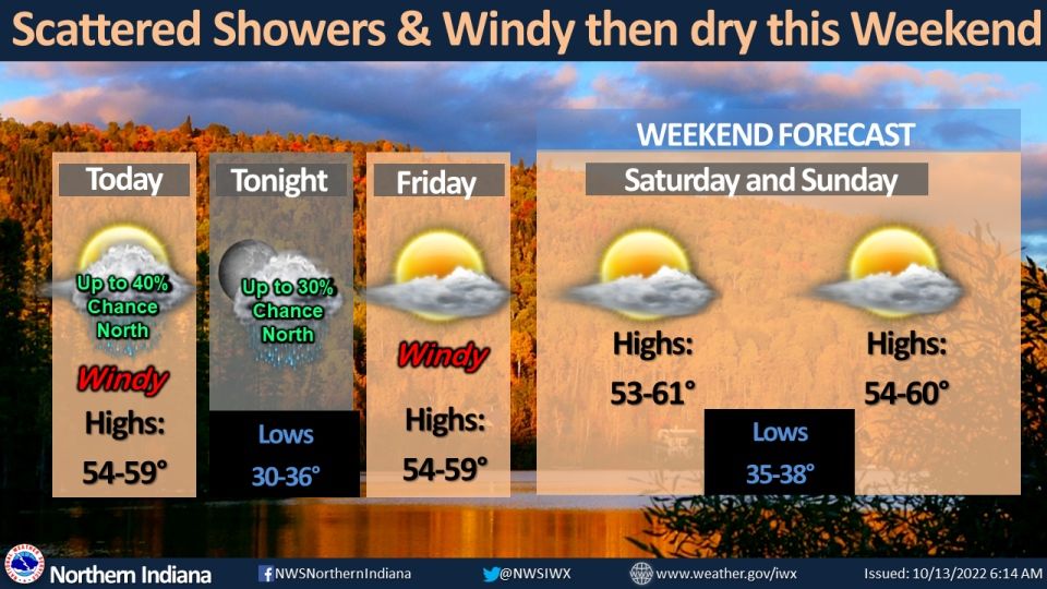 Fort Wayne, Indiana (October 13, 2022) – Scattered mostly light showers are possible near the north of the Michigan border through tonight, otherwise dry weather is expected through this weekend. Windy conditions are forecast today and then again Friday. There is some risk for field fires Friday with windy conditions and very low humidity. Otherwise highs will be in the 50s with lows in the 30s through Sunday.
