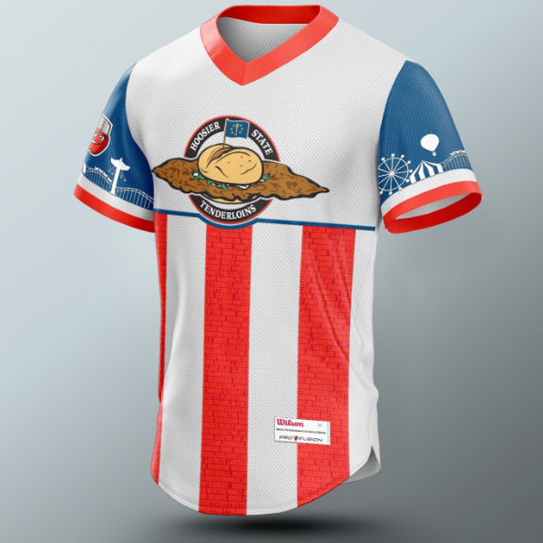 The Hoosier State Tenderloins will don specially designed uniforms. The team’s jerseys will be red, white, and blue, featuring a Hoosier State Tenderloins logo on the chest. The predominantly blue sleeves will have a fairgrounds motif. The base of the jersey includes red and white candy stripes, which subtly include the names of all 92 of Indiana’s counties.