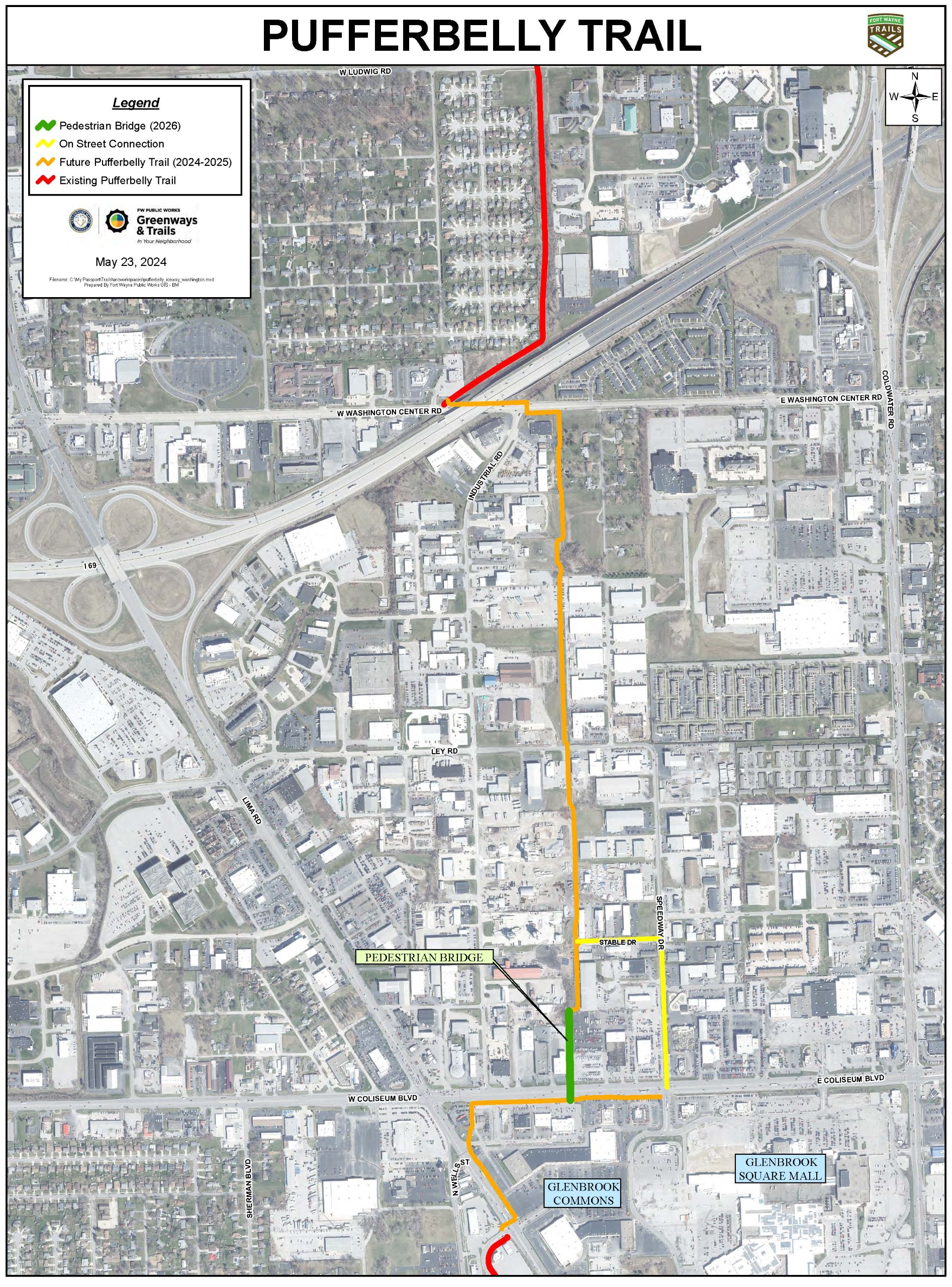 This 1.7 mile phase of the Pufferbelly Trail will be a 12-foot wide asphalt trail and will provide connectivity to nearly 700 businesses, retail areas, restaurants and entertainment, including Glenbrook Square Mall, Glenbrook Commons, SportONE Parkview Fieldhouse and SportONE Parkview Icehouse.