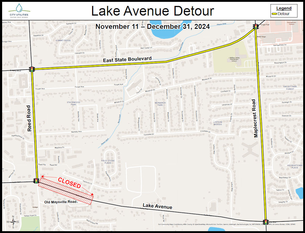 Fort Wayne, Indiana (November 8, 2024) – Lake Avenue, between Reed Road and Old Maysville Road will close beginning Monday, November 11, 2024, as crews begin work to replace the culvert and nearby road under Lake. The closure is set for six weeks, through the end of the year, and is part of the Pierson Drain Phase II stormwater improvement project.