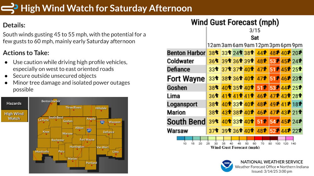 URGENT - WEATHER MESSAGE National Weather Service Northern Indiana 934 PM EDT Fri Mar 14 2025 INZ005>009-012>015-017-018-020-022>027-032>034-103-104-116-203-204- 216-MIZ078>081-177-277-OHZ001-002-004-005-015-016-024-025-151345- /O.UPG.KIWX.HW.A.0001.250315T1600Z-250315T2200Z/ /O.NEW.KIWX.WI.Y.0003.250315T0400Z-250316T0000Z/ Elkhart-Lagrange-Steuben-Noble-De Kalb-Starke-Pulaski-Marshall- Fulton IN-Whitley-Allen IN-White-Cass IN-Miami-Wabash-Huntington- Wells-Adams-Grant-Blackford-Jay-Northern La Porte-Eastern St. Joseph IN-Northern Kosciusko-Southern La Porte-Western St. Joseph IN-Southern Kosciusko-Cass MI-St. Joseph MI-Branch-Hillsdale- Northern Berrien-Southern Berrien-Williams-Fulton OH-Defiance- Henry-Paulding-Putnam-Van Wert-Allen OH- 934 PM EDT Fri Mar 14 2025 /834 PM CDT Fri Mar 14 2025/ ...WIND ADVISORY IN EFFECT UNTIL 8 PM EDT /7 PM CDT/ SATURDAY... * WHAT...South winds 20 to 30 mph tonight into Saturday evening. Gusts up to 45 mph expected tonight, and up to 55 mph by Saturday afternoon. A few gusts up to 60 mph are possible Saturday afternoon. * WHERE...Portions of northern Indiana, southwest Michigan, and northwest Ohio. * WHEN...Until 8 PM EDT /7 PM CDT/ Saturday. * IMPACTS...Gusty winds will blow around unsecured objects. Tree limbs could be blown down and a few power outages may result. * ADDITIONAL DETAILS...A line of showers and thunderstorms is expected tonight into Saturday morning that could bring higher wind gusts. PRECAUTIONARY/PREPAREDNESS ACTIONS... Winds this strong can make driving difficult, especially for high profile vehicles. Use extra caution. Secure outdoor objects. && $$ MCD