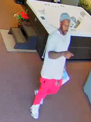 The person of interest is described as being a black male, in his later 30’s or early 40’s, roughly 6 feet tall, with a beard that was thin on both sides, and having an average build. He was wearing red sweatpants, red stocking cap and had a cross necklace.