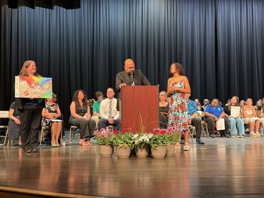 ACPL Director of Partnerships and Programs Beth Boatright, Jefferson Middle School Principal Nick Sharin, Winning Artist Quinn Kilby. Photo courtesy of the Allen County Public Library.