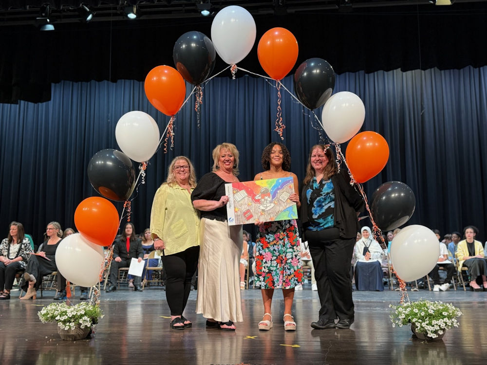 Jefferson Middle School Media Specialist Dee Birch, FWCS Media Services Manager Michelle Houser, Winning Artist Quinn Kilby, ACPL Director of Partnerships and Programs Beth Boatright. Photo courtesy of the Allen County Public Library.
