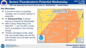 SPC has upgraded the Severe Storm Risk to “ENHANCED”Fort Wayne, Indiana (June 17, 2025) – A strong cold front and an upper level disturbance will bring a good chance for severe storms on Wednesday. The Storm Prediction Center has upgraded the severe storm risk Wednesday to an “enhanced” risk.