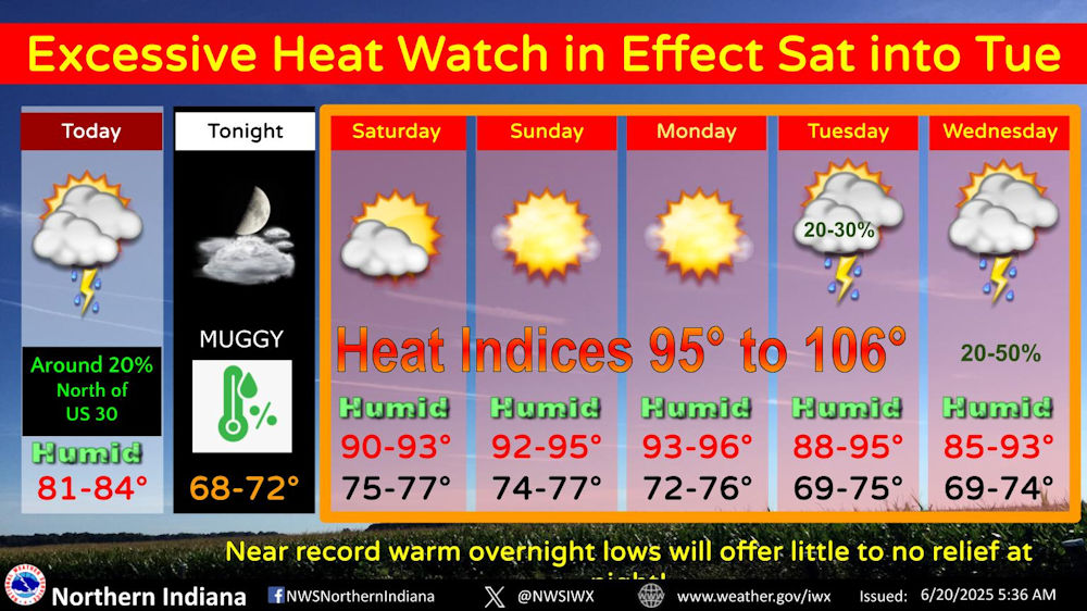 Fort Wayne, Indiana (June 10, 2025) – An excessive heat watch is in effect Sat-Tue. Heat indices will range from 95 to 106F. The hottest conditions are expected Sun-Mon. Consecutive days of excessive heat and humidity combined with very warm low temperatures in the 70s can be especially hazardous for vulnerable populations as the overnight hours provide little relief from the heat. Prepare: https://www.weather.gov/safety/heat