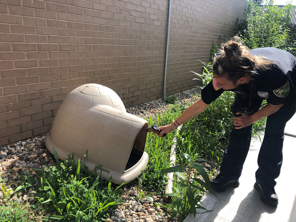 Fort Wayne Animal Care and Control officer taking a temperature reading from inside a dog house. Photo provided by ACC.