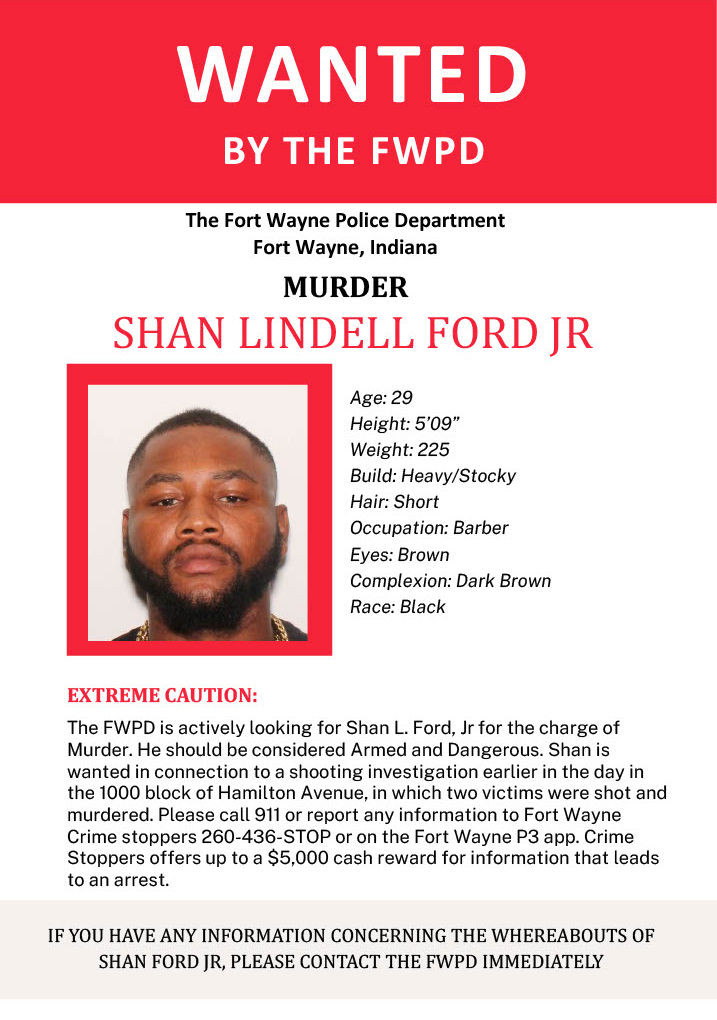 The FWPD is actively looking for Shan L. Ford, Jr. for the charge of Murder. He should be considered Armed and Dangerous. Shan is wanted in connection to a shooting investigation earlier in the day in the 1000 block of Hamilton Avenue, in which two victims were shot and murdered. Please call 9-1-1 or report any information to Fort Wayne Crime stoppers (260) 436-STOP or on the Fort Wayne P3 app. Crime Stoppers offers up to a $5,000 cash reward for information that leads to an arrest.