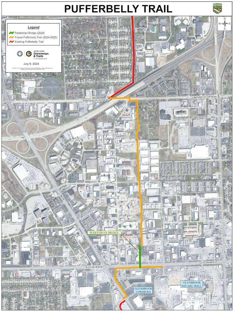 Fort Wayne, Indiana (June 27, 2025) – A new traffic signal has been installed as part of the Pufferbelly Trail project at the intersection of West Washington Center Road and Industrial Road. The signal is currently operating in flash and will begin operating with full control on July 8. When the trail project is complete, the new signal will aid trail users in crossing West Washington Center Road along the continuation of the Pufferbelly Trail.