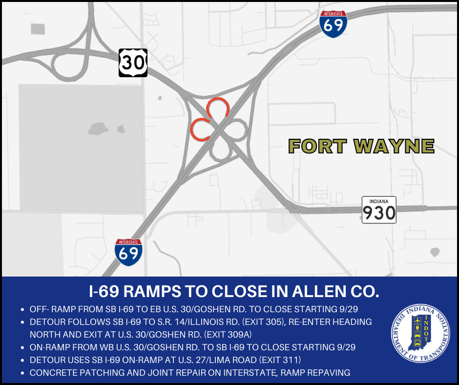 Allen County, Indiana (September 25, 2025) – The Indiana Department of Transportation announces the closure of two I-69 ramps at U.S. 30/Goshen Road.