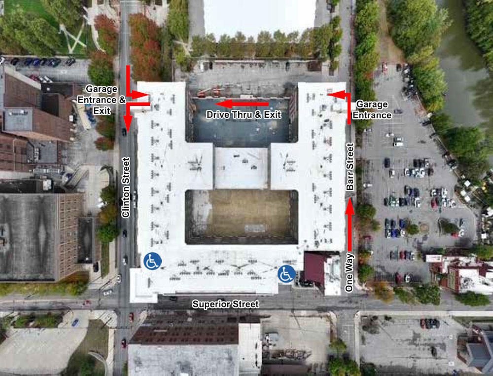 Until construction is complete on The Lofts at Headwaters Park, a $98 million mixed-use development at the northeast corner of Clinton and Superior streets, Barr Street will be one-way going north. Vehicles can enter the Lofts at Headwaters Garage off Barr Street and enter and exit the garage on Clinton Street.