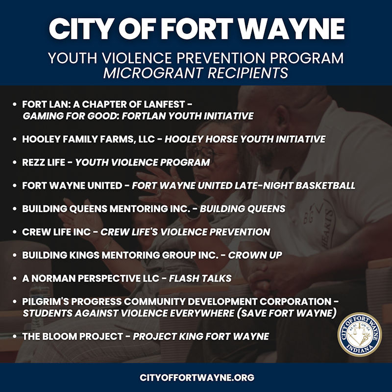 Video of the October 15, 2025, announcement of the City of Fort Wayne’s Youth Violence Prevention Program Microgrant Recipients.