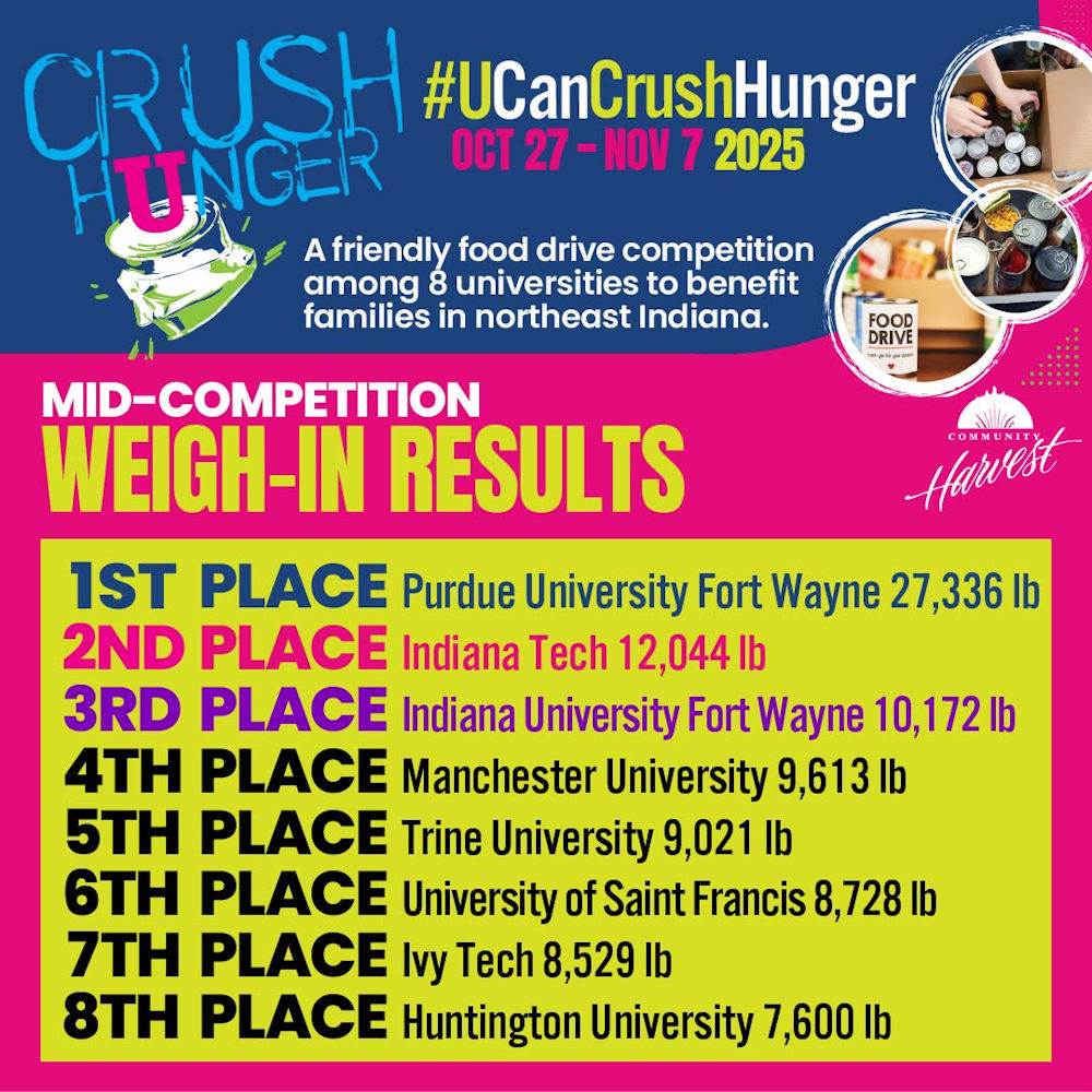 Fort Wayne, Indiana (October 31, 2025) – Community Harvest Food Bank’s 11th Annual ‘U Can Crush Hunger’ Campaign is in full gear! Our first weigh-in at all participating schools is now complete, and we have exciting news to share! As of Monday, October 31st, a whopping 93,043 pounds of food have been raised toward our overall goal of 125,000 pounds! The competition ends this Friday, November 7th, so there is still time to vote for your school online at www.chfb.org and each $1 donated counts as 4 pounds of food. Huntington University, Indiana Tech, Indiana University Fort Wayne, Ivy Tech, Manchester University, Purdue University Fort Wayne, Trine University, and the University of Saint Francis are extremely competitive in this year’s U Can Crush Hunger holiday food drive. Every dollar and pound of food raised in this competition will support hunger relief initiatives within the counties where food and funds are collected, including all partner school pantries.
