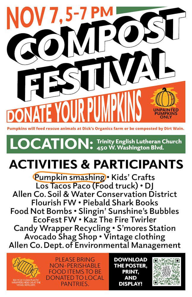 Compost Festival will be held on November 7, 2025, from 5 to 7 pm at Trinity English Lutheran Church, 450 West Washington Boulevard, in downtown Fort Wayne, Indiana.