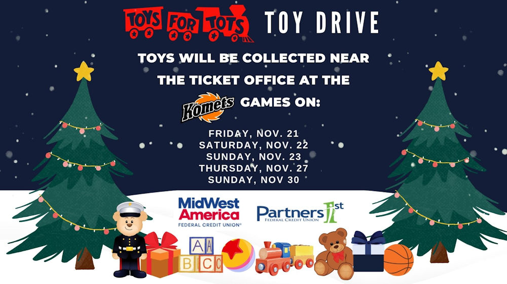 New, unwrapped toys for children up to age 18 will be collected near the MidWest America Ticket Office at the following Fort Wayne Komets games: