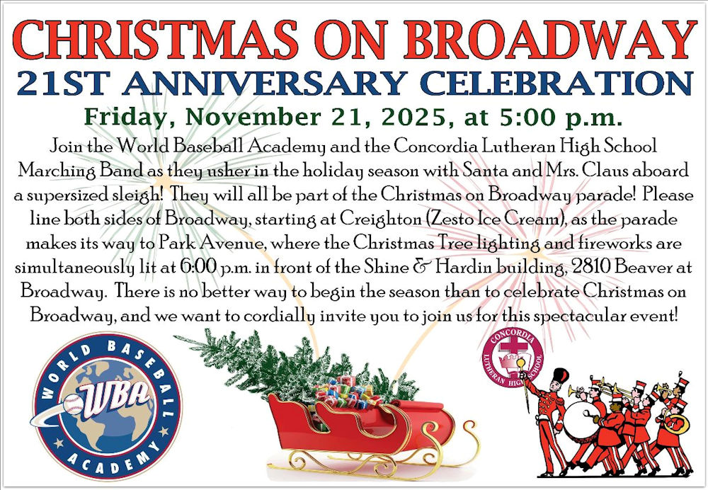 Fort Wayne’s gateway to the holiday season, “Christmas On Broadway,” will take place this year on Friday, November 21, 2025, beginning at 5:00 p.m. This will be the 21st year that this beloved community-wide celebration has delighted families from across Northeast Indiana. World Baseball Academy (WBA) will be the featured charitable organization, with youth from the WBA participating in both the parade and tree lighting. The tree lighting and brilliant fireworks display is in the heart of the ’07 Neighborhood on the Broadway Plaza, in front of the Shine & Hardin building.