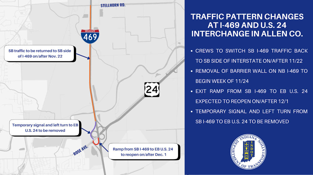 On or after Monday, December 1, the southbound I-469 exit ramp to eastbound U.S. 24 is expected to reopen. Once the ramp to eastbound U.S. 24 reopens, traffic using the southbound exit ramp from I-469 to Rose Avenue will no longer be allowed to turn left to eastbound U.S. 24.