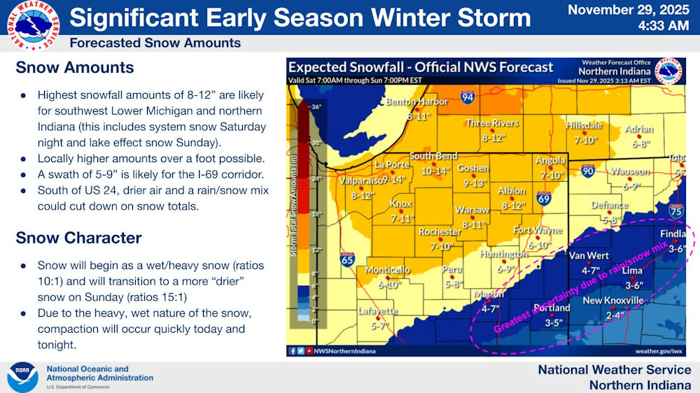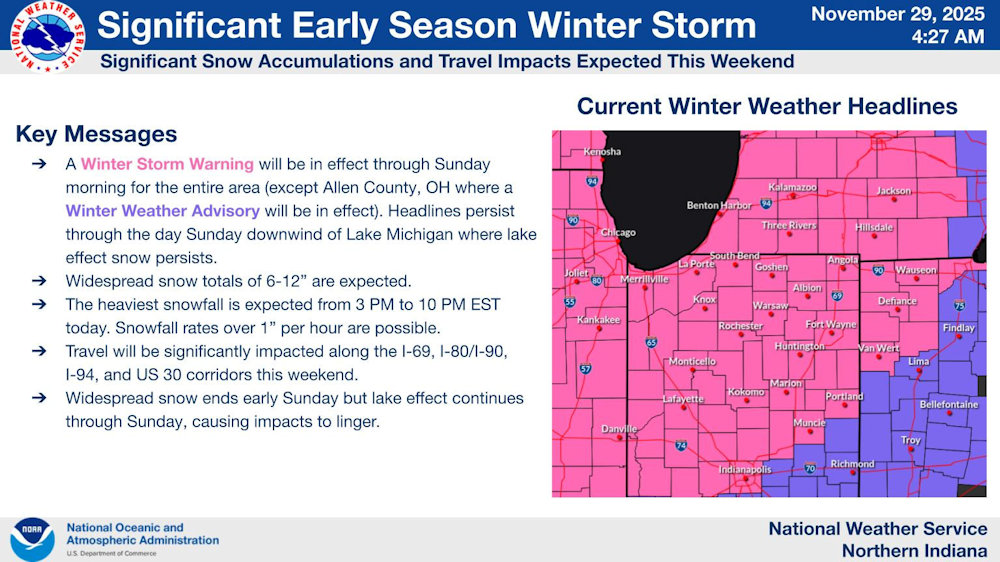 (November 29, 2025) – A Winter Storm Warning will be in effect through Sunday morning for the entire area (except Allen County, OH where a Winter Weather Advisory will be in effect). Widespread snow totals of 6-12” are expected.