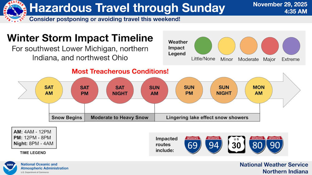 • Travel will be significantly impacted along the I-69, I-80/I-90, I-94, and US 30 corridors this weekend.