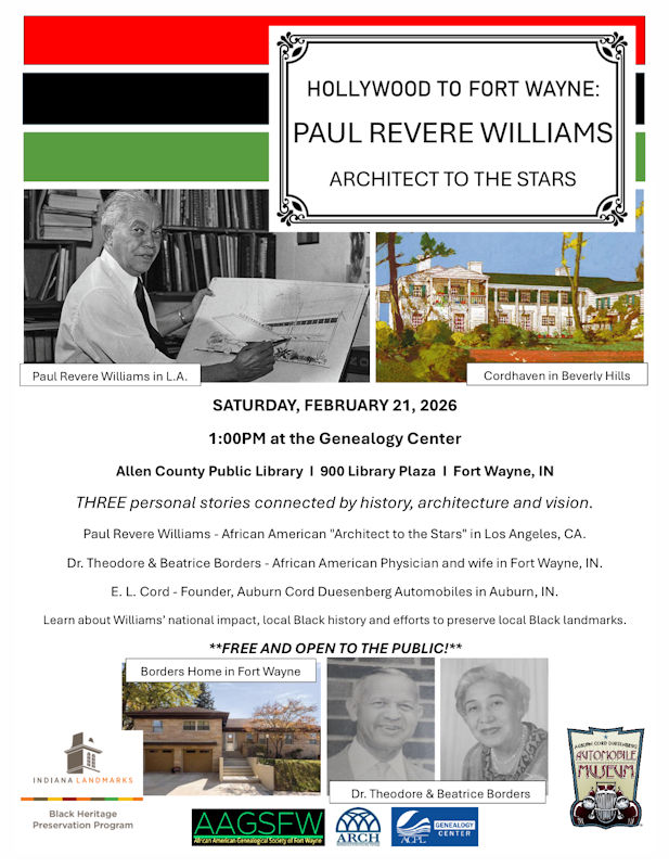 FREE PUBLIC Lecture on Saturday, February 21 at the ACPL Genealogy CenterFort Wayne, Indiana (February 19, 2026) – Learn how three human stories connect with history, architecture and a shared aesthetic vision. Paul Revere Williams – African American “Architect to the Stars” in Los Angeles, CA. E. L. Cord – Founder, Auburn Cord Duesenberg Automobiles in Auburn, IN. Dr. Theodore & Beatrice Borders – Prominent African American Physician and his wife in Fort Wayne, IN.