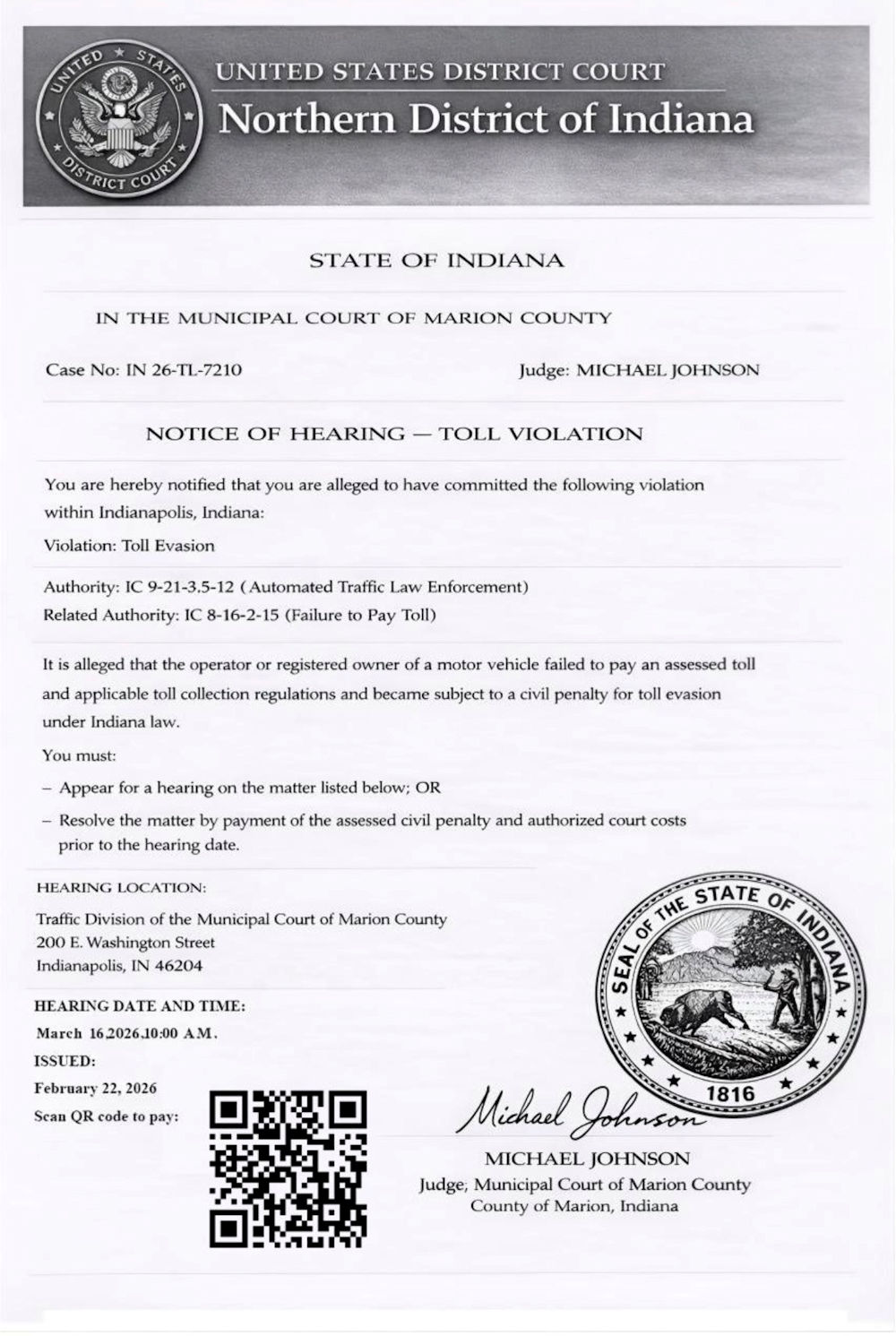 Indianapolis, Indiana (March 18, 2026) – Thousands of Hoosiers are receiving a sternly worded text warning — supposedly sent by a court — that they must immediately pay fines for toll road violations or appear for a hearing.
