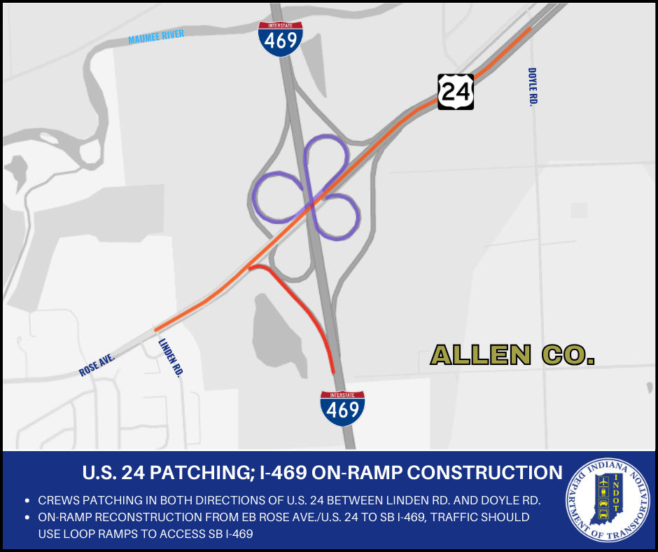 Starting on or after March 23, crews will be working on U.S. 24 between Linden Road and Doyle Road. There will be alternating lane closures in both directions for patching work. Crews will also close the on-ramp from eastbound Rose Ave./U.S. 24 to southbound I-469 for reconstruction. Traffic needing to access southbound I-469 should utilize the loop ramps.