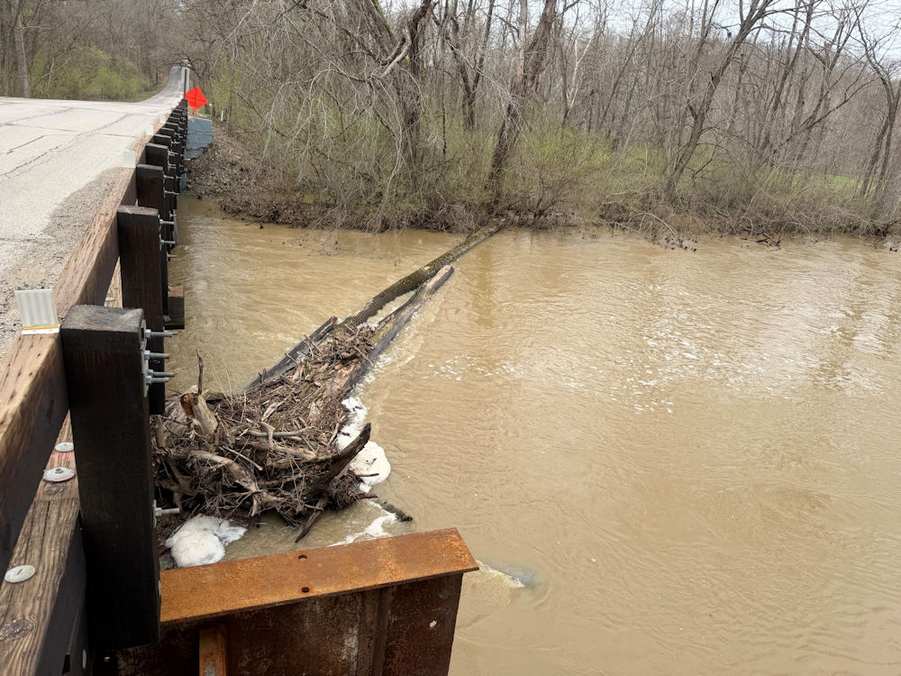 Allen County, Indiana (April 3, 2026) – While monitoring the status of our swollen rivers and their effect on county bridges and other infrastructure, Allen County Highway Department staff noted a dangerous logjam that spans the width of Cedar Creek at the Hursh Road Bridge.