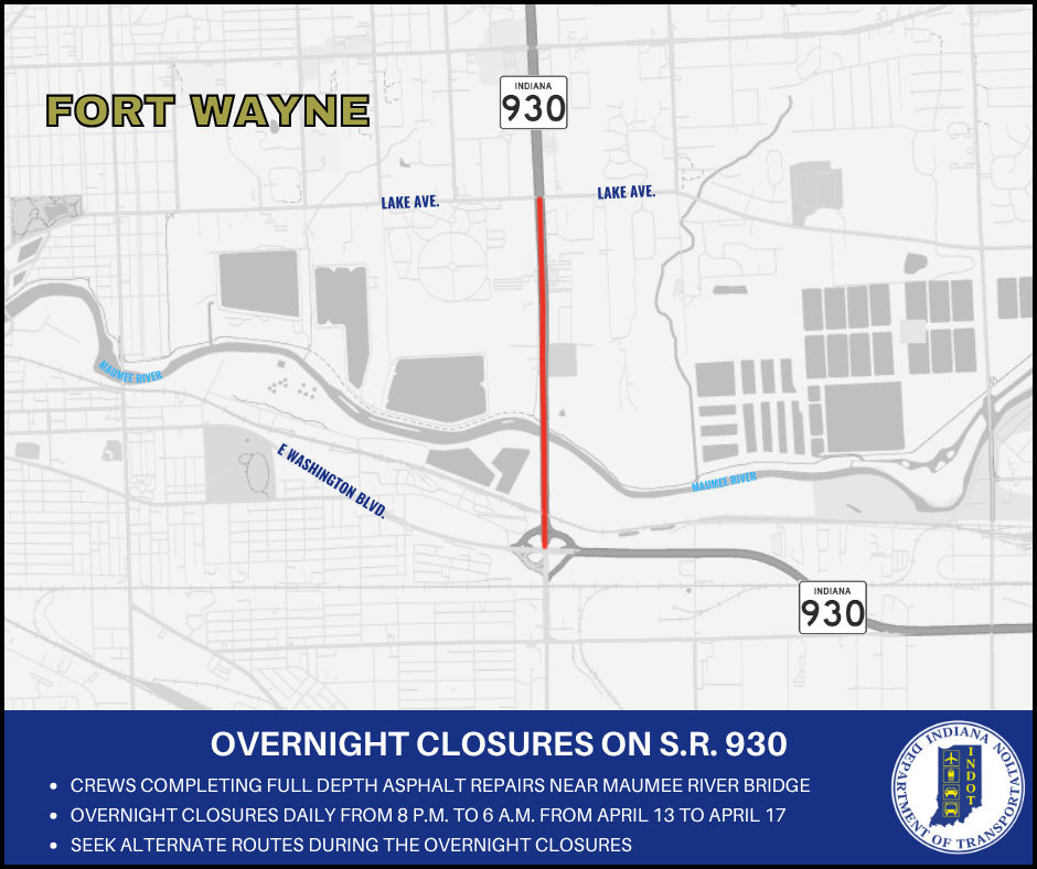Fort Wayne, Indiana (April 10, 2026) – The Indiana Department of Transportation announces overnight lane closures on State Road 930/Coliseum Boulevard in Fort Wayne between Lake Avenue and S.R. 930/East Washington Boulevard.