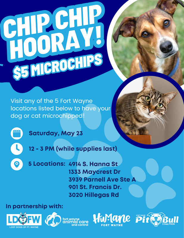 Fort Wayne, Indiana (April 13, 2026) – Fort Wayne Animal Care and Control in collaboration with coalition partners Humane Fort Wayne, Fort Wayne Pitbull Coalition, and Lost Dogs of Fort Wayne have announced a community microchip event that will be offered at 5 different locations across Fort Wayne, Indiana.