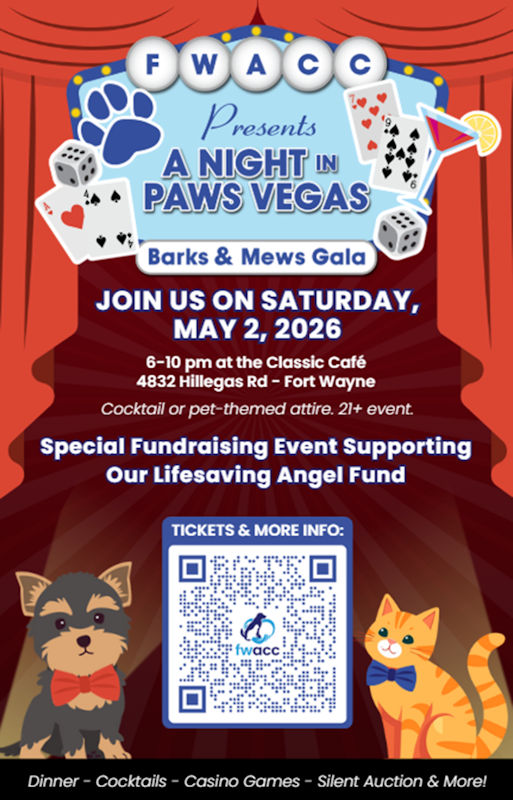 Fort Wayne Animal Care and Control is hosting their annual gala, the Barks and Mews, “A Night in Paws Vegas”, on May 2, 2026.