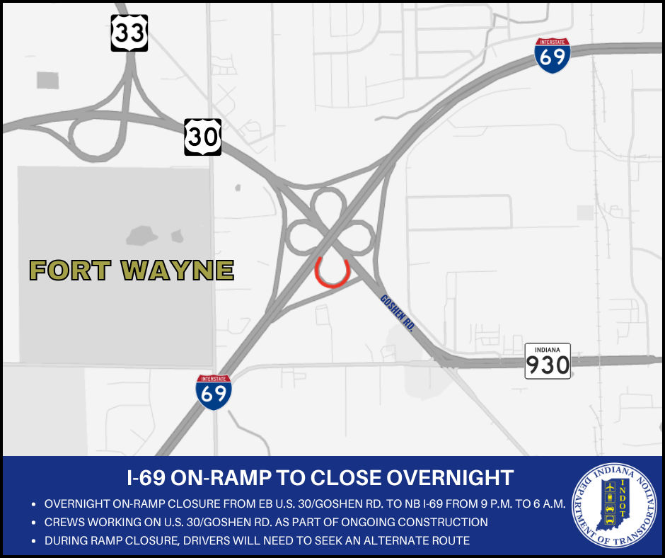 On Thursday, April 23, crews will close the on-ramp from eastbound U.S. 30/Goshen Road to northbound I-69 at or after 9 p.m. Pavement patching work will take place on U.S. 30/Goshen Road during this closure. Crews will reopen the ramp by 6 a.m. on Friday, April 24. All work is weather-dependent and schedules are subject to change.