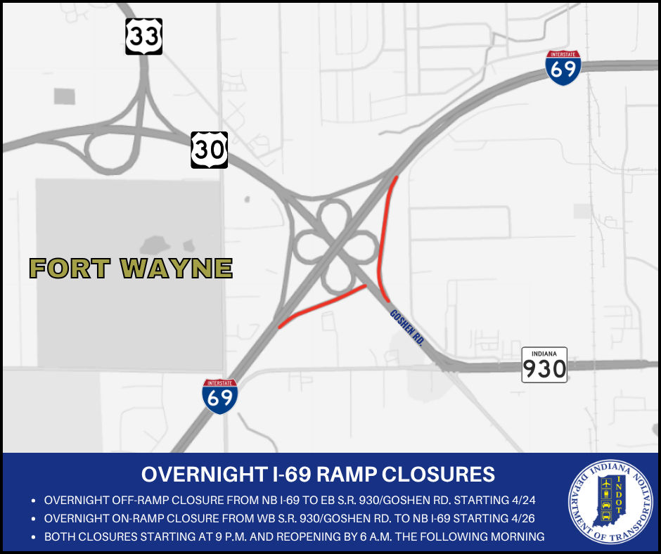 On Friday, April 24, crews will close the off-ramp from northbound I-69 to eastbound S.R. 930/Goshen Road at or after 9 p.m. Crews will reopen the ramp by 6 a.m. on Saturday April 25.