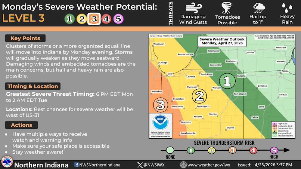 The National Weather Service reports that there is a potential for severe weather on Monday, April 27, 2026.