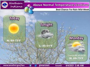 Fort Wayne, Indiana (April 4, 2021) – A perfect Easter Sunday is in store with many locations seeing highs in the 70s today (as well as Monday). Winds will be much lighter than yesterday, but the dry conditions persist so if you are planning any burning use caution. Clouds will be on the increase tonight into Monday with a small chance for a few showers or storms to clip locations north of US-30 during the day Monday. Better chances for showers and thunderstorms arrive Wednesday into Wednesday night.