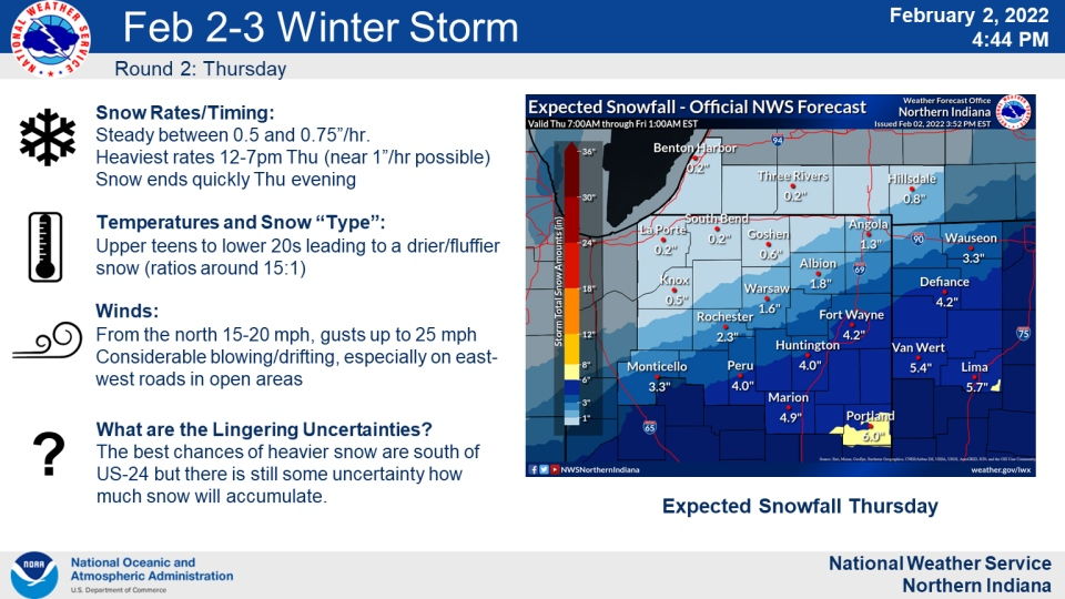 Fort Wayne, Indiana (February 2, 2022) – Round one of the winter storm has been under way today with counties in Ohio and in south-central Indiana still seeing an ongoing transition from rain to snow. Northwest Indiana and southern Michigan have seen several inches of snow today. Snow will continue this evening, with a brief lull tonight before round two begins Thursday. Temperatures tonight and tomorrow will remain in the upper teens to lower 20s.